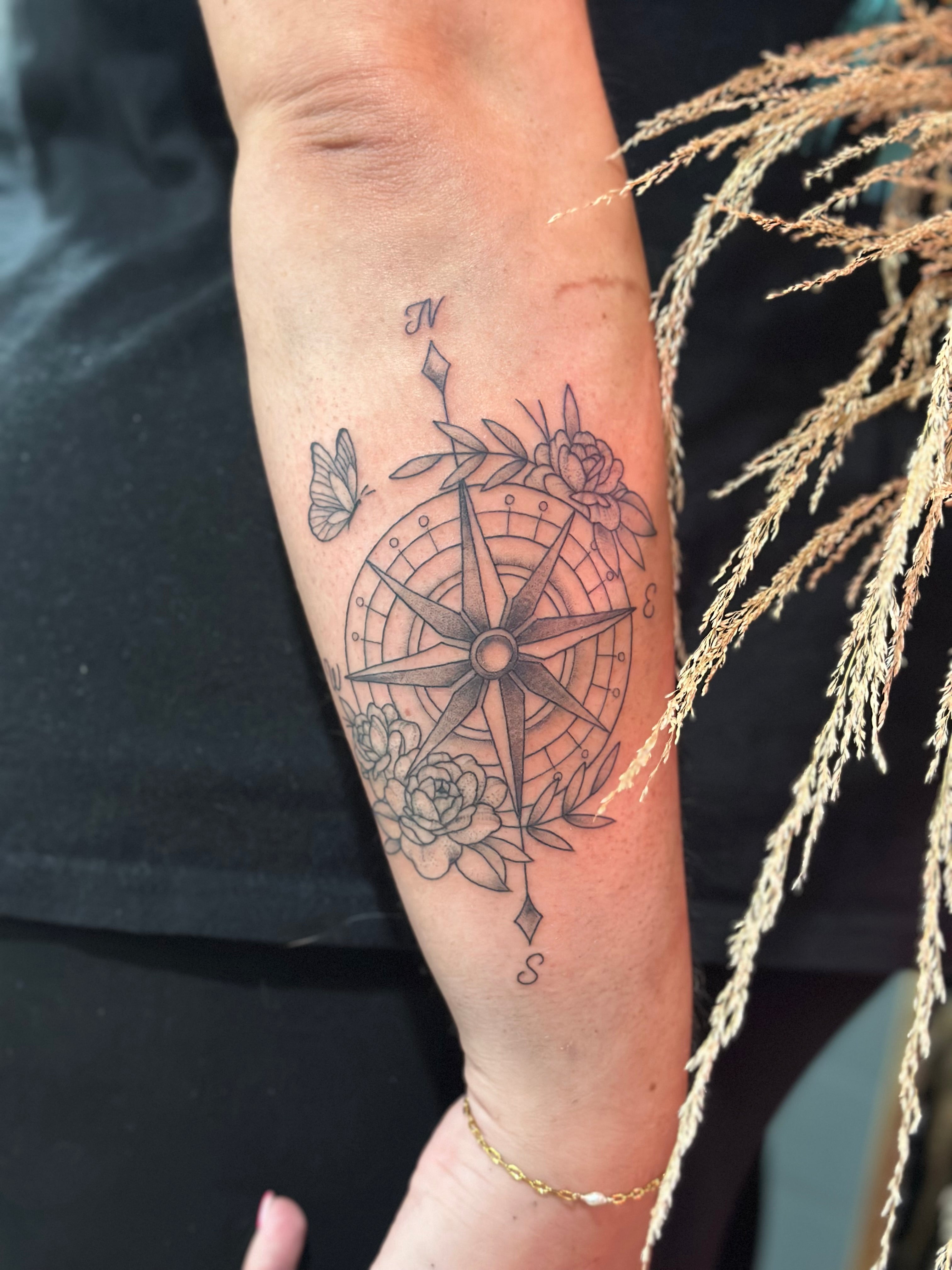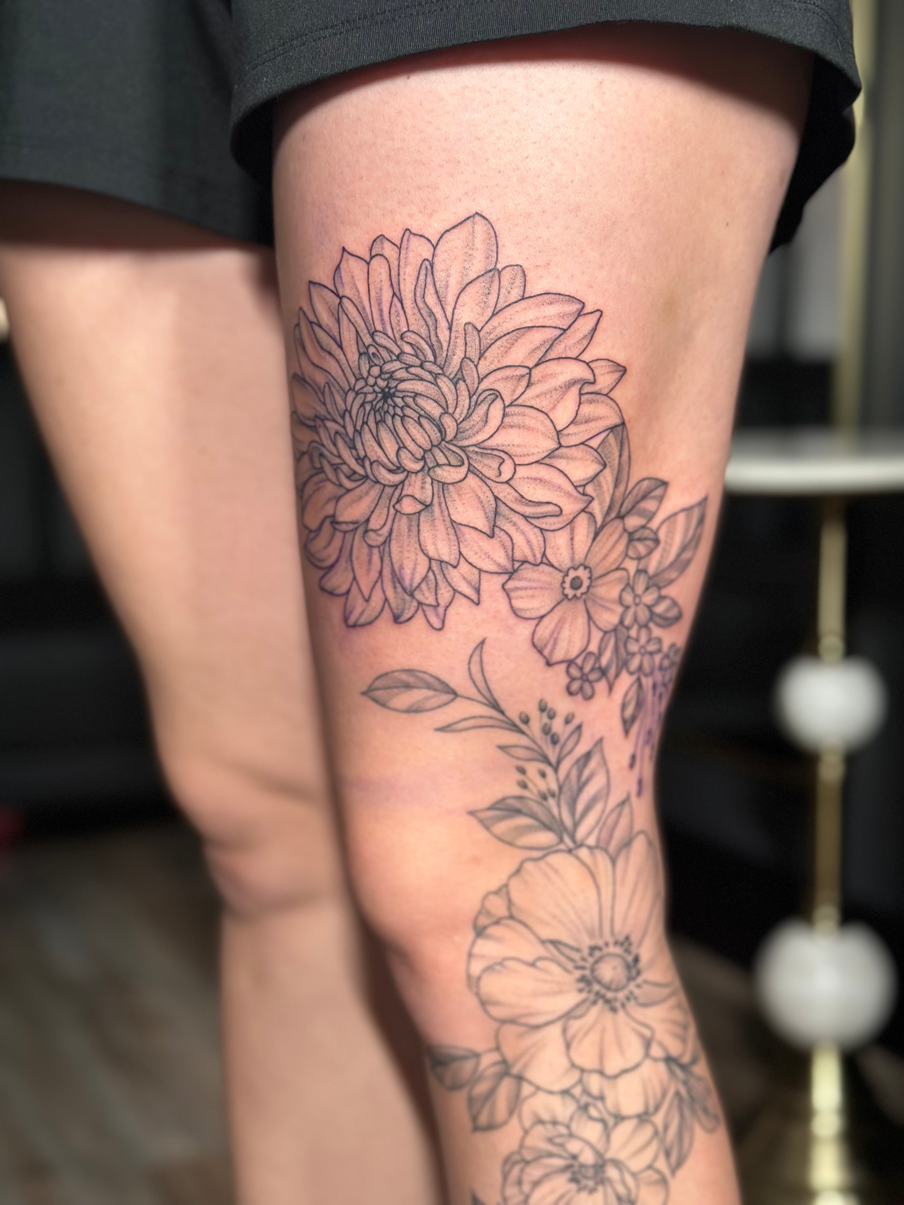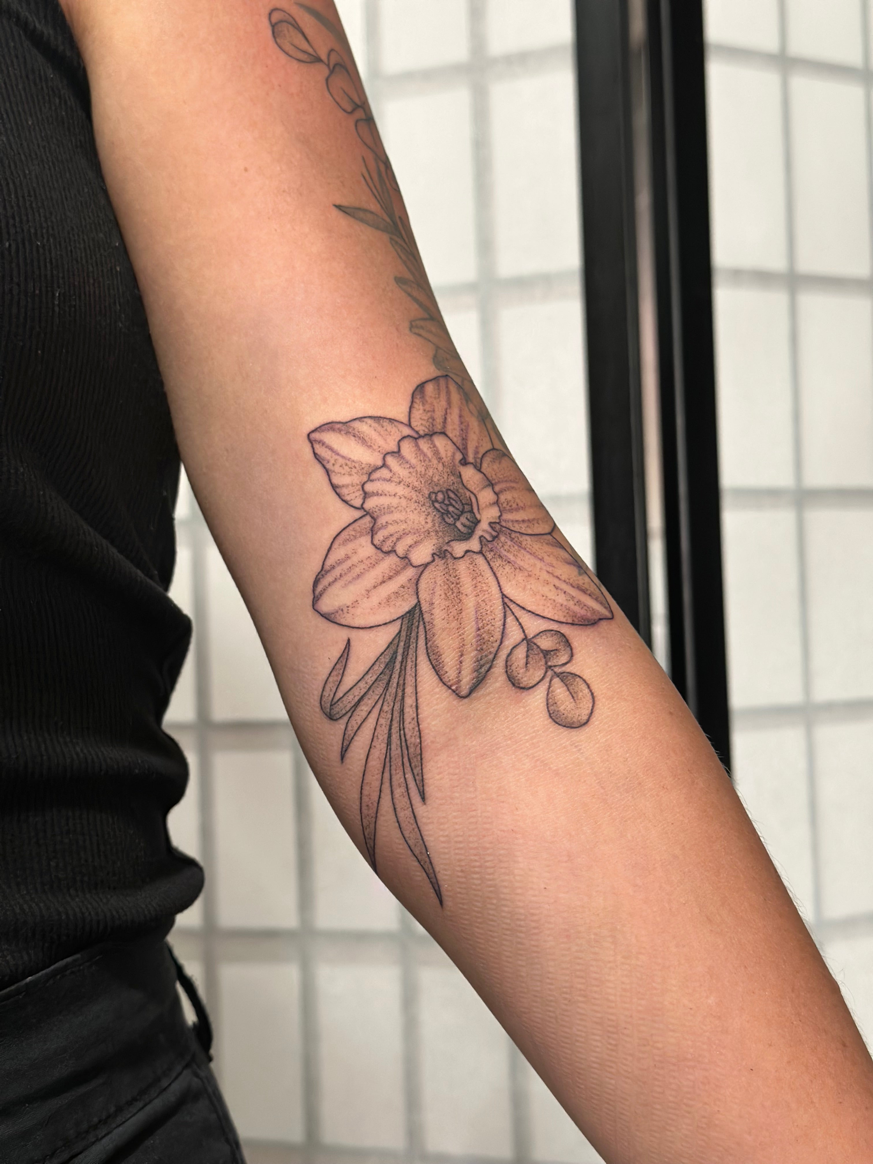 Her artistic style is beautifully versatile, from delicate florals and fine line work to bold traditional designs and abstract elements. She enjoys working in both black and grey and color, always eager to try something new and craft tattoos that are as unique as the people who wear them.
